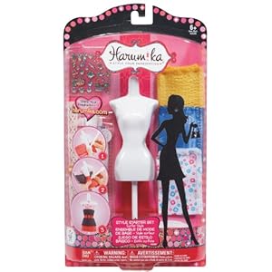 Each set comes with a miniature (roughly Barbie doll height) dressmaker form, a selection of fabric swatches and a "poker" tool to secure the fabrics to the form and create an outfit. Depending on which set you choose - and there are loads of different sets of varying sizes and costs - you may also have accessories like belts and decals. It's kind of hard to explain how this toy works until you show it. Check it out below: